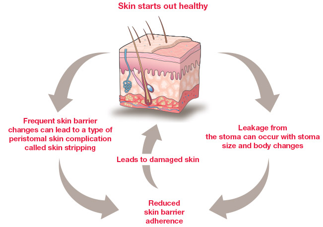 - Mechanical trauma: Poor adhesion or an ill-fitting skin barrier can lead to too-frequent barrier changes, which may result in damaging skin stripping.